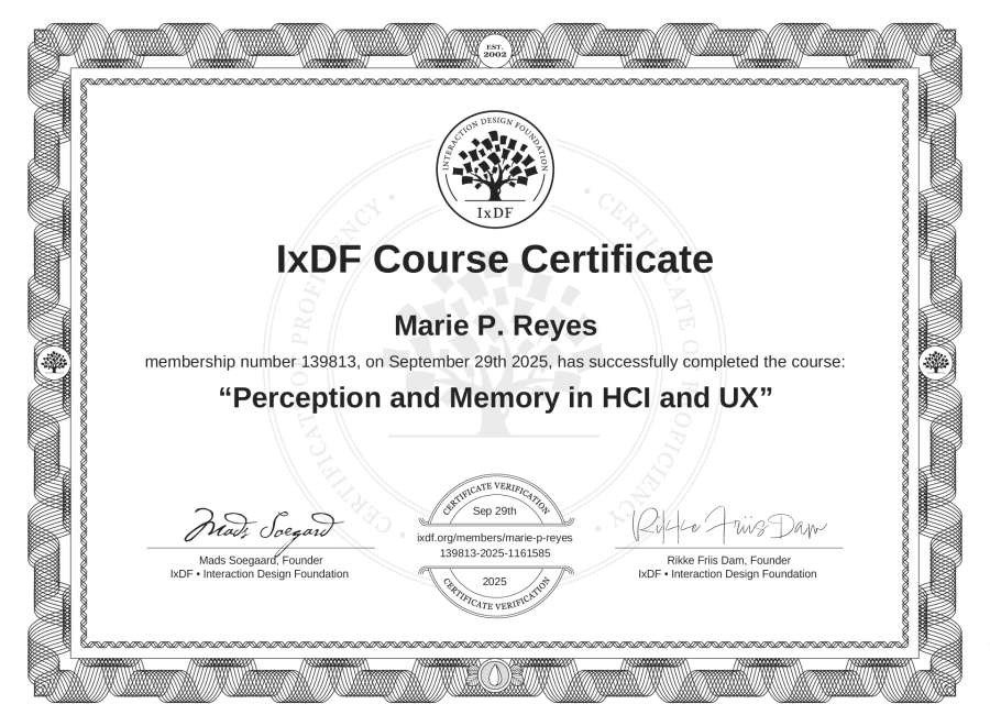 Marie P. Reyes's IxDF Course Certificate: Perception and Memory in HCI and UX