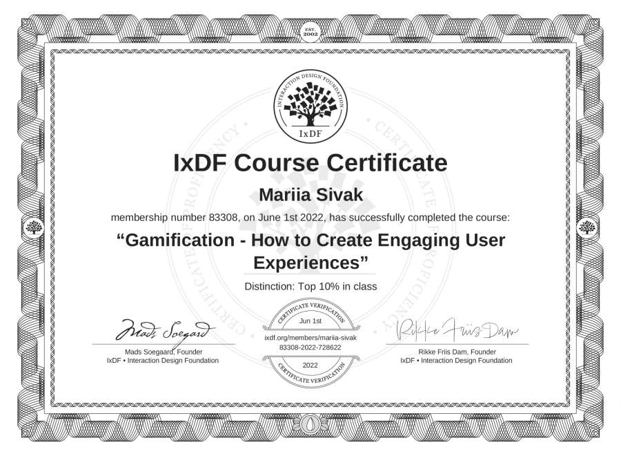 Mariia Sivak's IxDF Course Certificate: Gamification - How to Create Engaging User Experiences