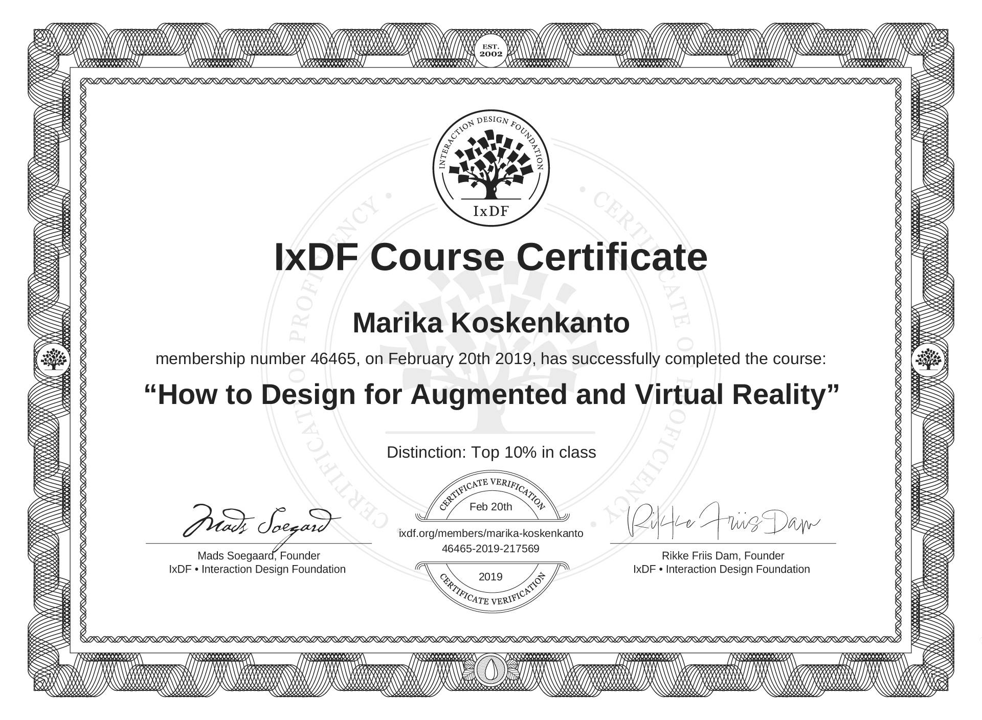 Marika Koskenkanto's IxDF Course Certificate: How to Design for Augmented and Virtual Reality
