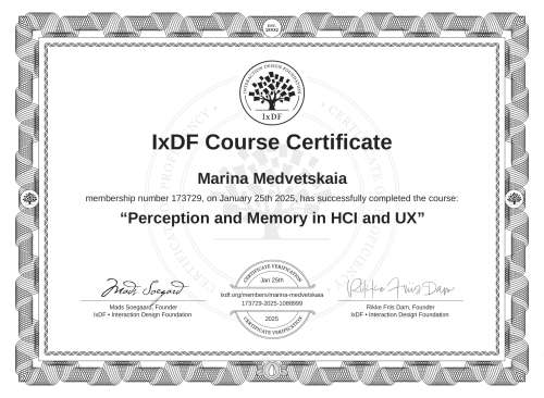 This IxDF Membership Certificate is issued to Marina Medvetskaia in formal recognition of their membership of the IxDF, global leader in design education.