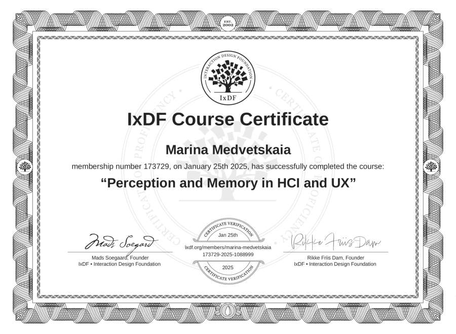 Marina Medvetskaia's IxDF Course Certificate: Perception and Memory in HCI and UX