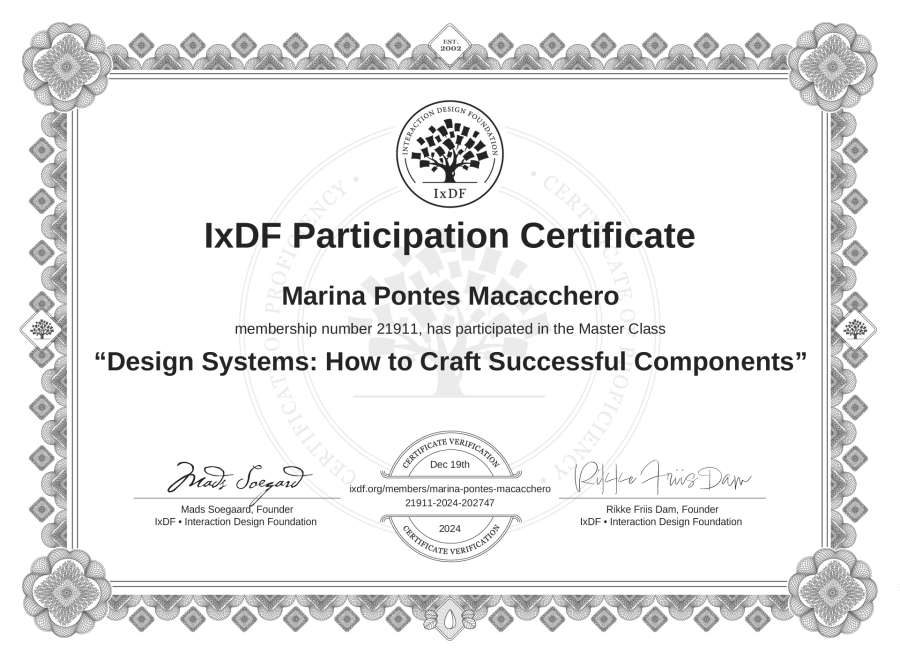 Marina Pontes Macacchero's IxDF Masterclass Certificate: Design Systems: How to Craft Successful Components