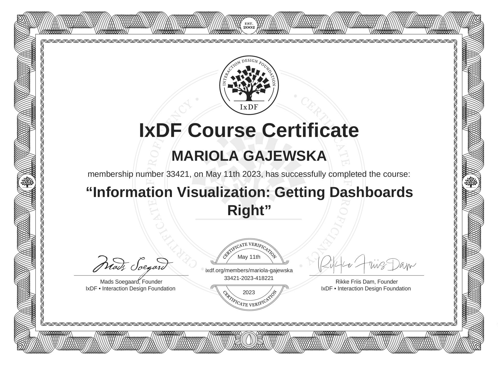 MARIOLA GAJEWSKA's IxDF Course Certificate: Information Visualization: Getting Dashboards Right