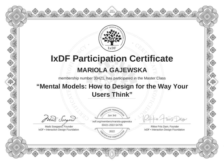 MARIOLA GAJEWSKA's IxDF Masterclass Certificate: Mental Models: How to Design for the Way Your Users Think