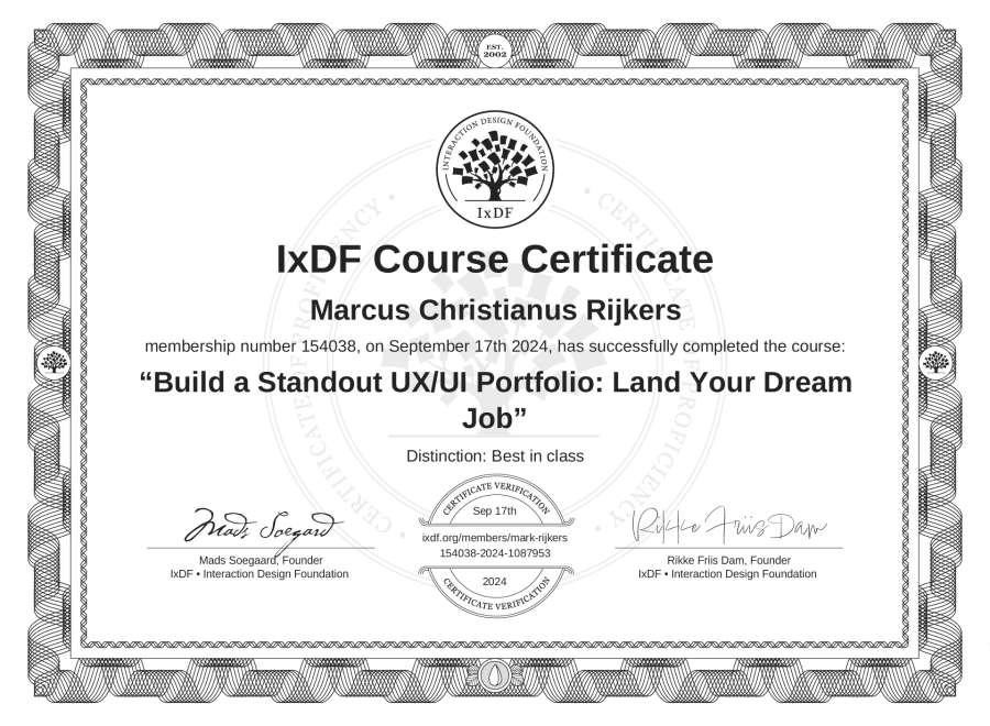 Marcus Christianus Rijkers's IxDF Course Certificate: Build a Standout UX/UI Portfolio: Land Your Dream Job