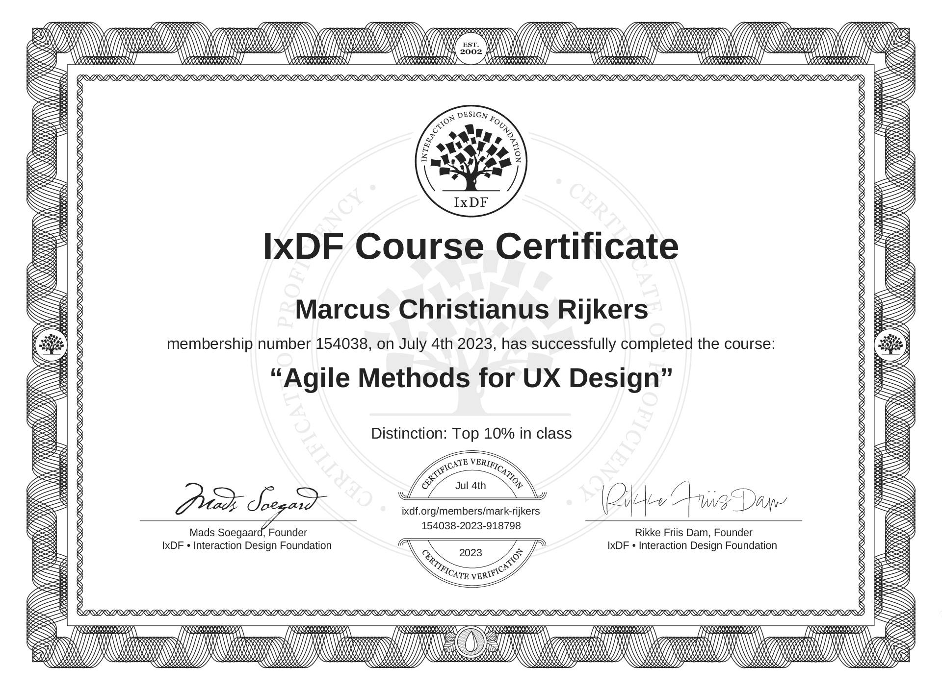 The IxDF Course Certificate above is awarded to Marcus Christianus Rijkers with a Top 10% Distinction in formal recognition of their coursework surpassing the rigorous benchmarks of exceptional performance established by the IxDF Educational Codex.