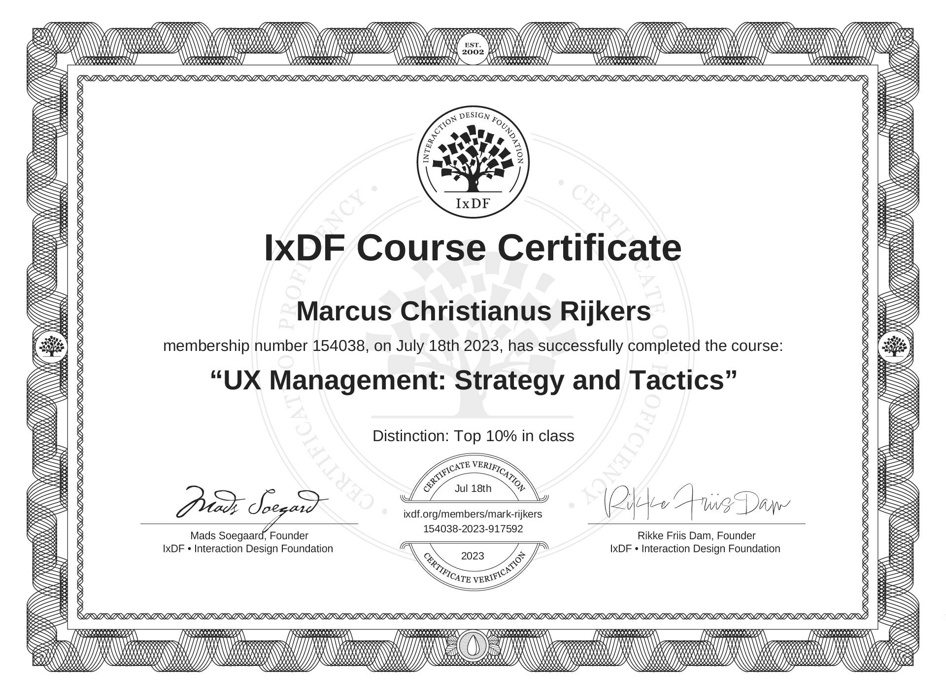 The IxDF Course Certificate above is awarded to Marcus Christianus Rijkers with a Top 10% Distinction in formal recognition of their coursework surpassing the rigorous benchmarks of exceptional performance established by the IxDF Educational Codex.