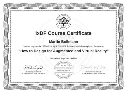 IxDF Course Certificates are awarded to Martin Bollmann in formal recognition of their coursework surpassing the rigorous benchmarks of exceptional performance established by the IxDF Educational Codex.