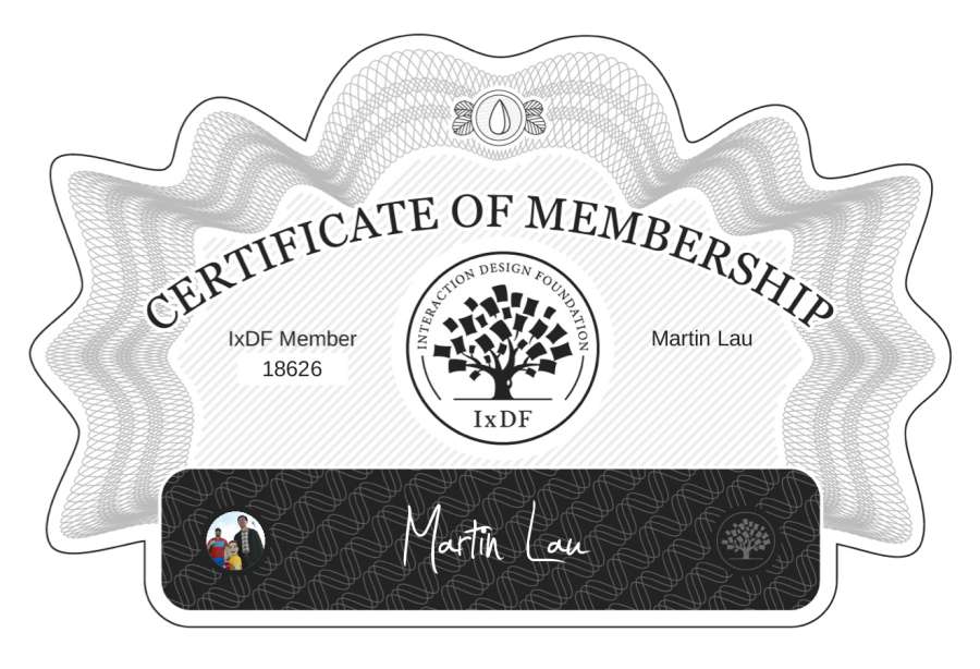 The Membership Certificate below verifies that Martin Lau is a member of Interaction Design Foundation.