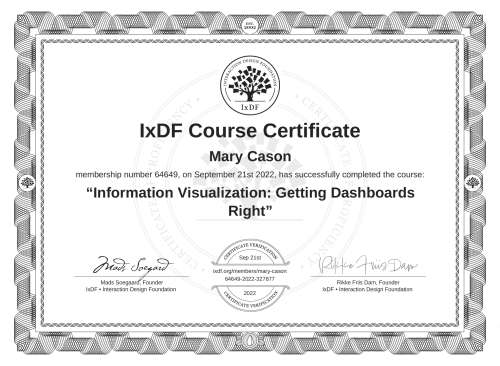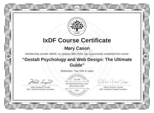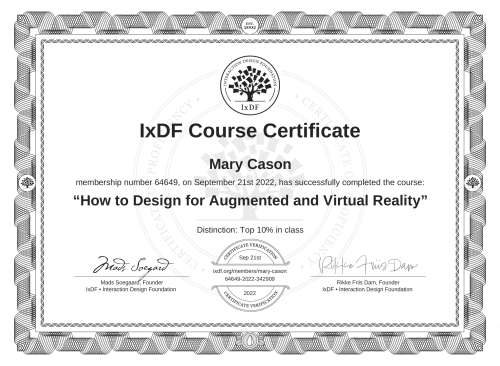 This IxDF Membership Certificate is issued to Mary Cason in formal recognition of their membership of the IxDF, global leader in design education.
