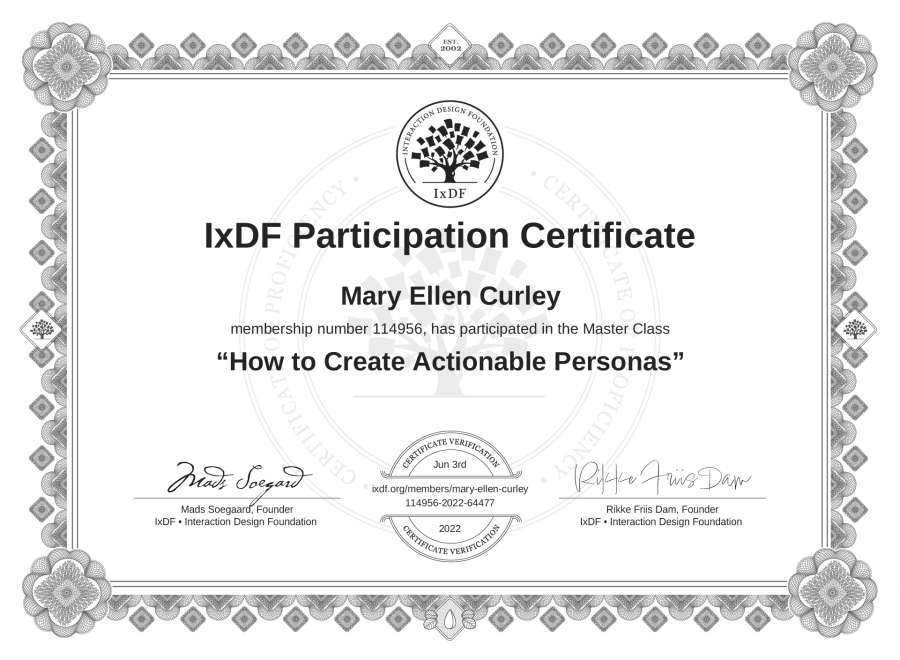 Mary Ellen Curley's IxDF Masterclass Certificate: How to Create Actionable Personas