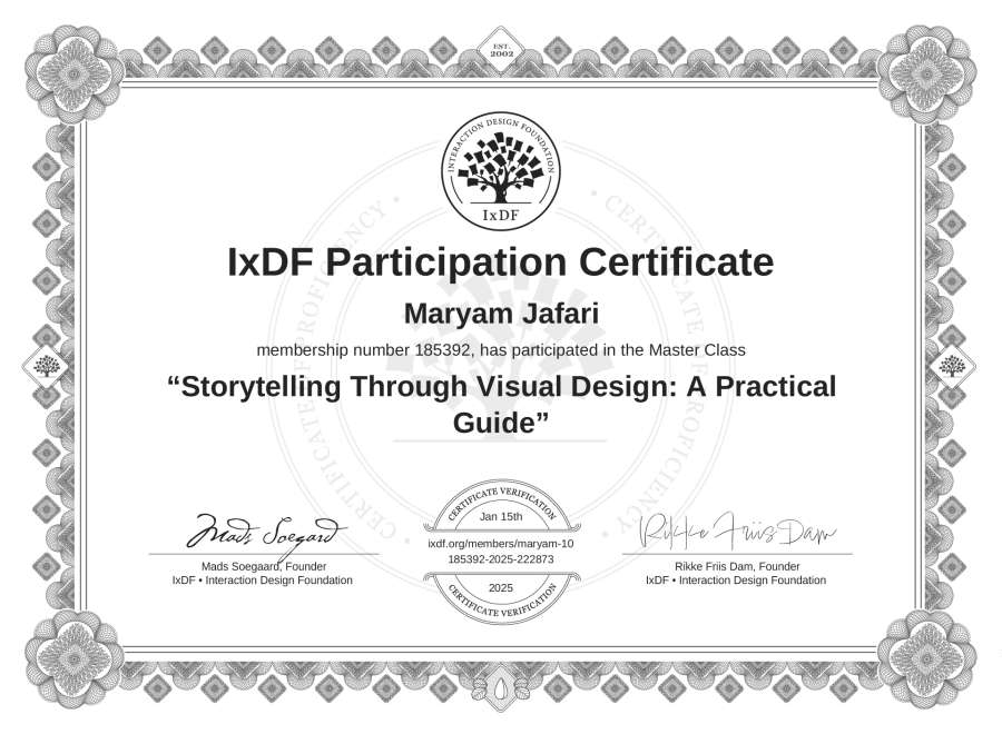 Maryam Jafari's IxDF Masterclass Certificate: Storytelling Through Visual Design: A Practical Guide