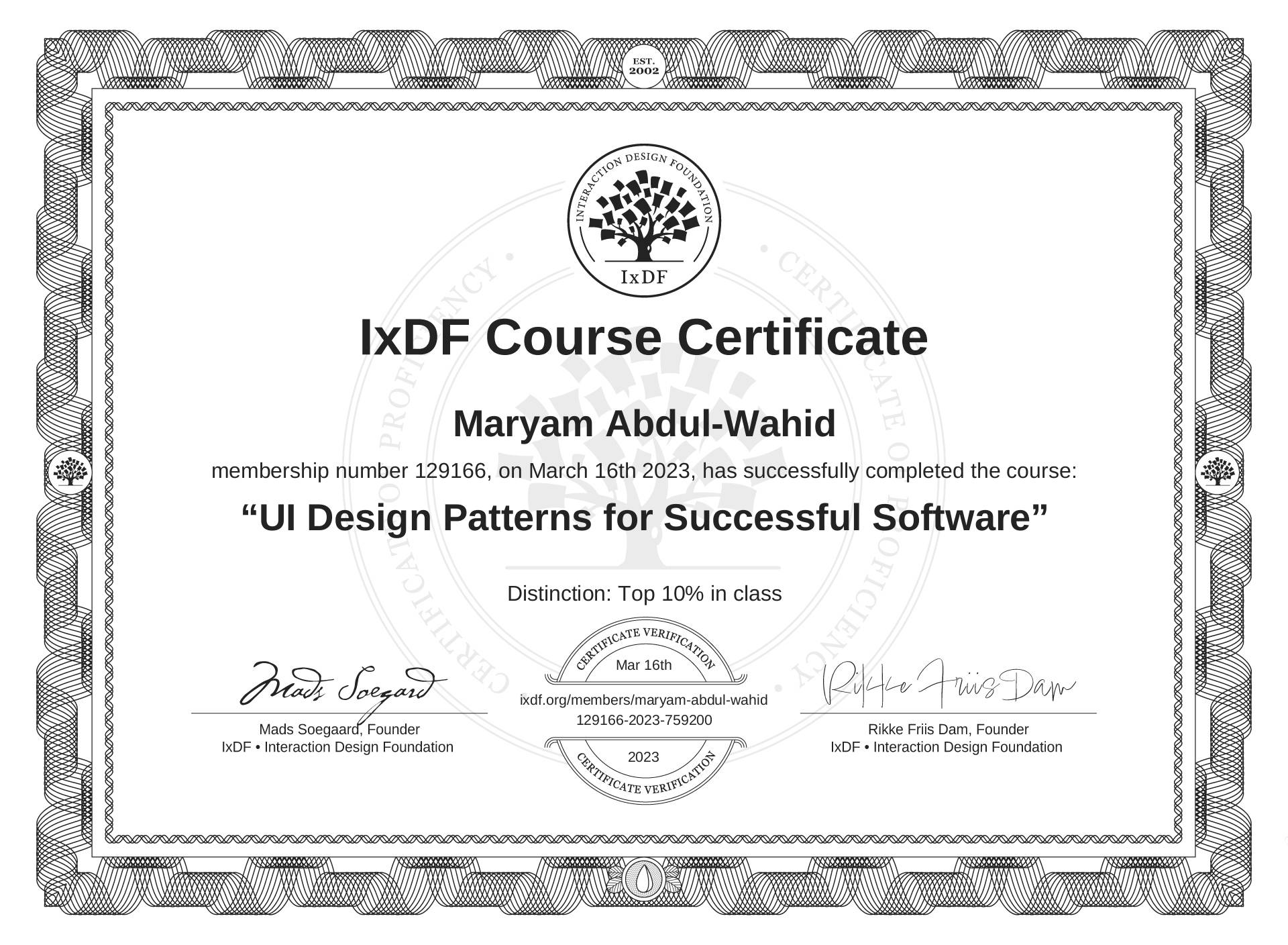 The IxDF Course Certificate above is awarded to Maryam Abdul-Wahid with a Top 10% Distinction in formal recognition of their coursework surpassing the rigorous benchmarks of exceptional performance established by the IxDF Educational Codex.