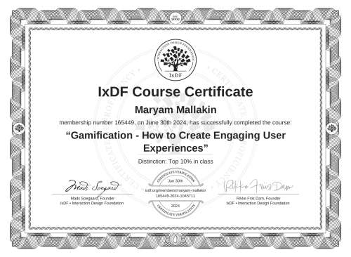 IxDF Course Certificates are awarded to Maryam Mallakin in formal recognition of their coursework surpassing the rigorous benchmarks of exceptional performance established by the IxDF Educational Codex.