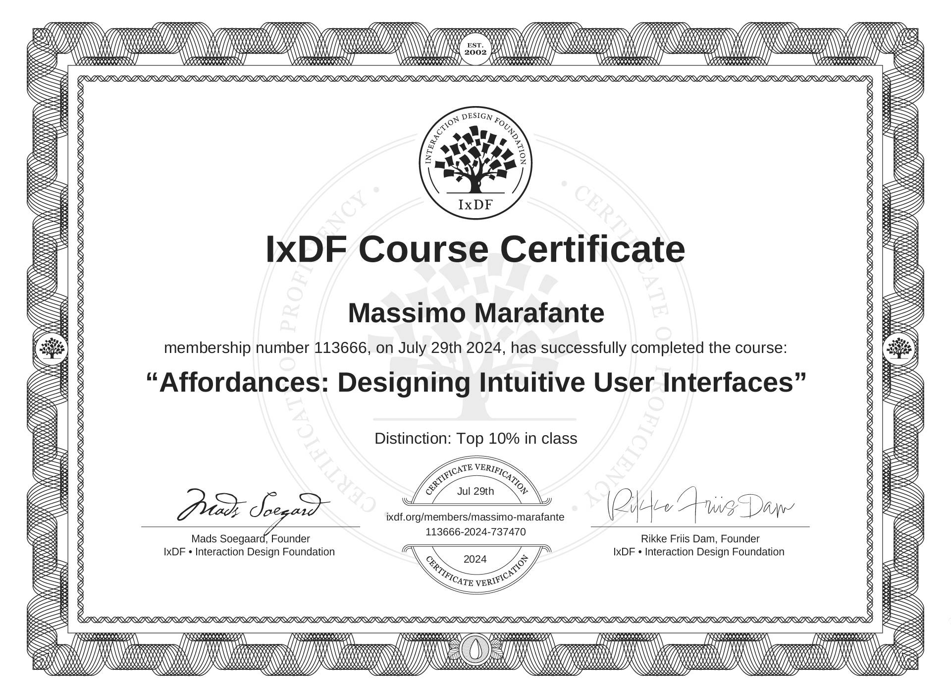 The IxDF Course Certificate above is awarded to Massimo Marafante with a Top 10% Distinction in formal recognition of their coursework surpassing the rigorous benchmarks of exceptional performance established by the IxDF Educational Codex.
