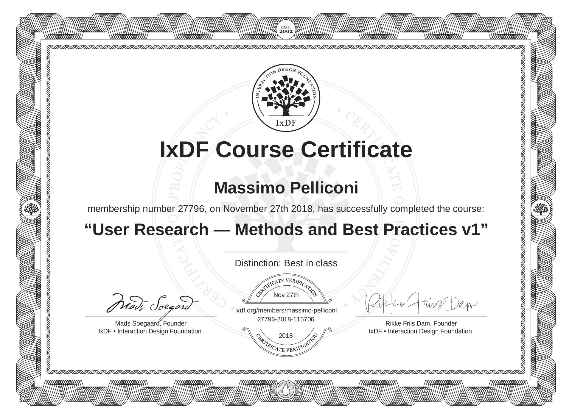 Massimo Pelliconi's IxDF Course Certificate: User Research — Methods and Best Practices v1