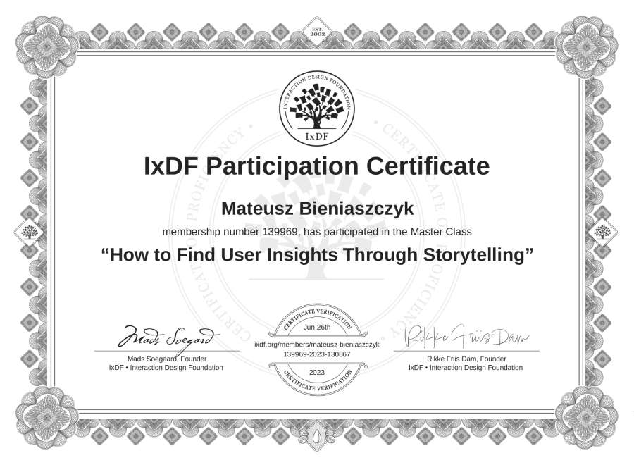 Mateusz Bieniaszczyk's IxDF Masterclass Certificate: How to Find User Insights Through Storytelling