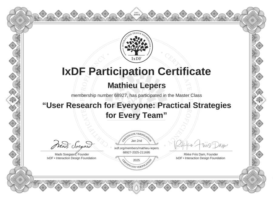 Mathieu Lepers's IxDF Masterclass Certificate: User Research for Everyone: Practical Strategies for Every Team
