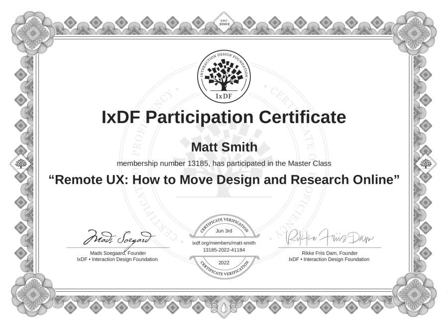 Matt Smith's IxDF Masterclass Certificate: Remote UX: How to Move Design and Research Online