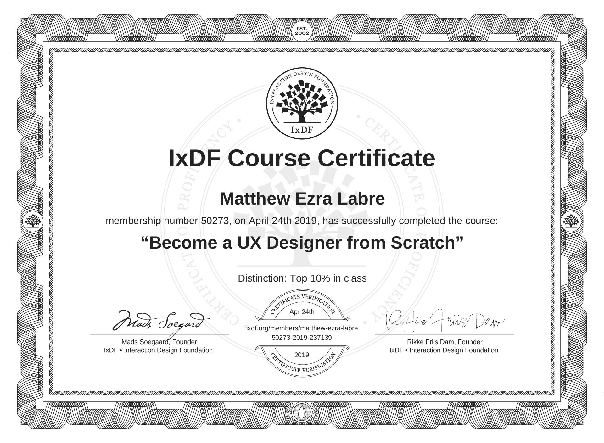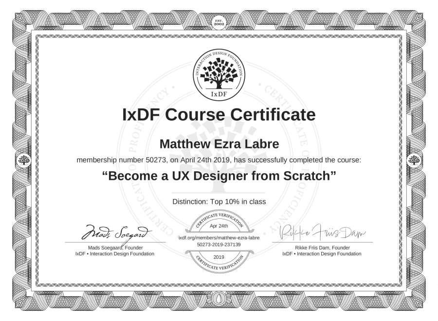 Matthew Ezra Labre's IxDF Course Certificate: Become a UX Designer from Scratch