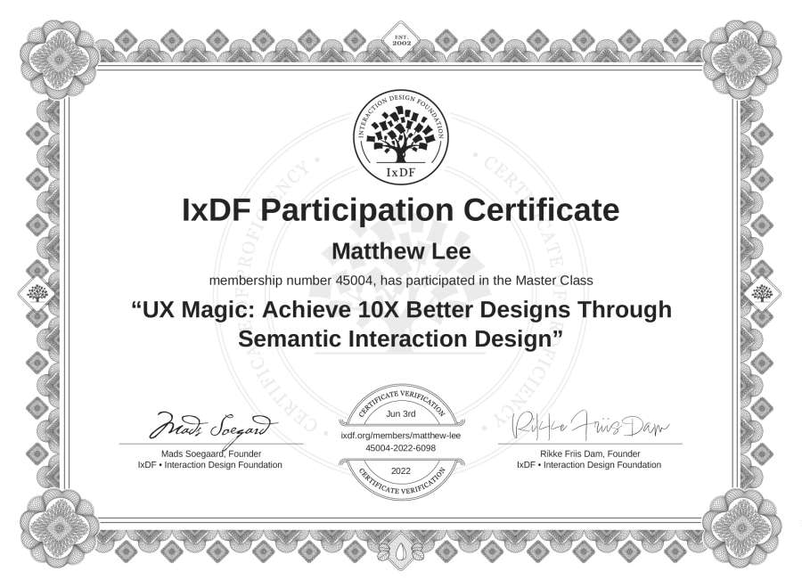 Matthew Lee's IxDF Masterclass Certificate: UX Magic: Achieve 10X Better Designs Through Semantic Interaction Design