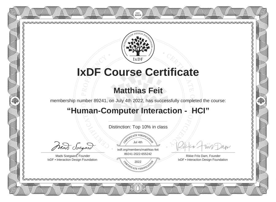The IxDF Course Certificate above is awarded to Matthias Feit with a Top 10% Distinction in formal recognition of their coursework surpassing the rigorous benchmarks of exceptional performance established by the IxDF Educational Codex.