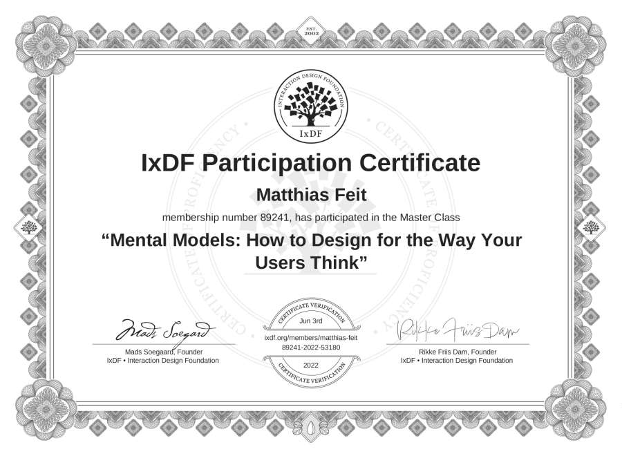 Matthias Feit's IxDF Masterclass Certificate: Mental Models: How to Design for the Way Your Users Think