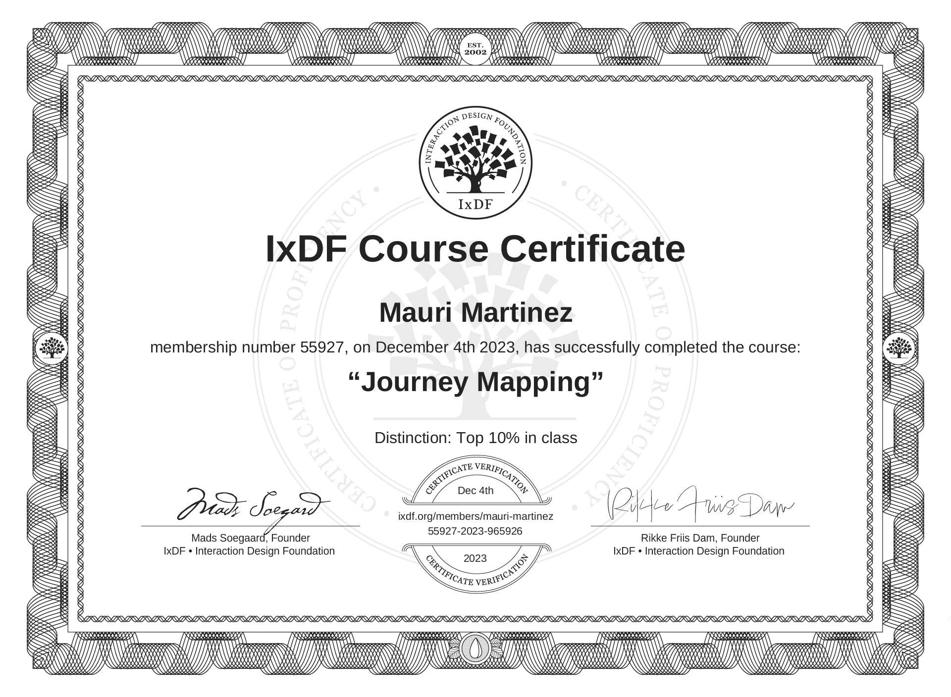 The IxDF Course Certificate above is awarded to Mauri Martinez with a Top 10% Distinction in formal recognition of their coursework surpassing the rigorous benchmarks of exceptional performance established by the IxDF Educational Codex.