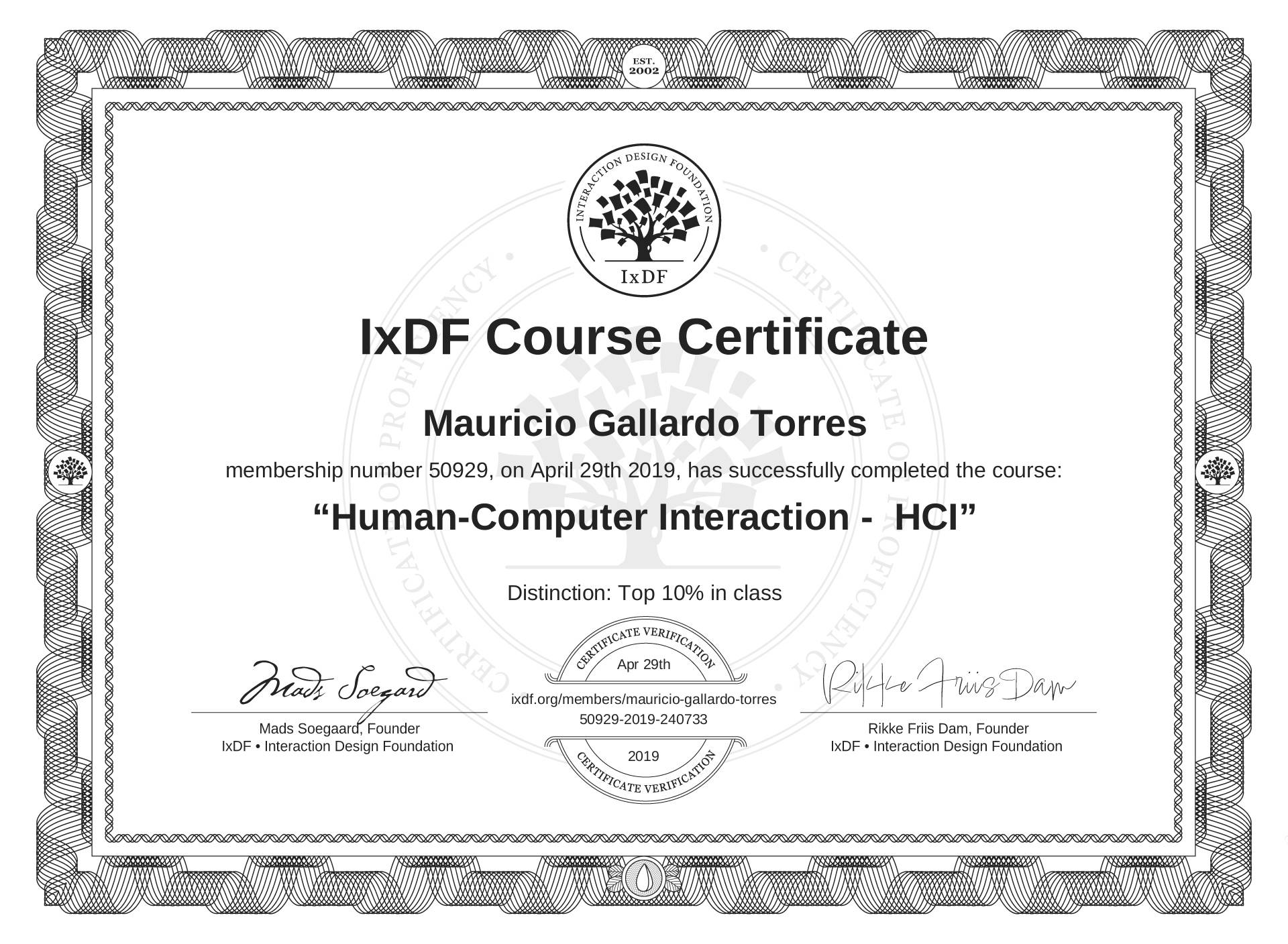 The IxDF Course Certificate above is awarded to Mauricio Gallardo Torres with a Top 10% Distinction in formal recognition of their coursework surpassing the rigorous benchmarks of exceptional performance established by the IxDF Educational Codex.