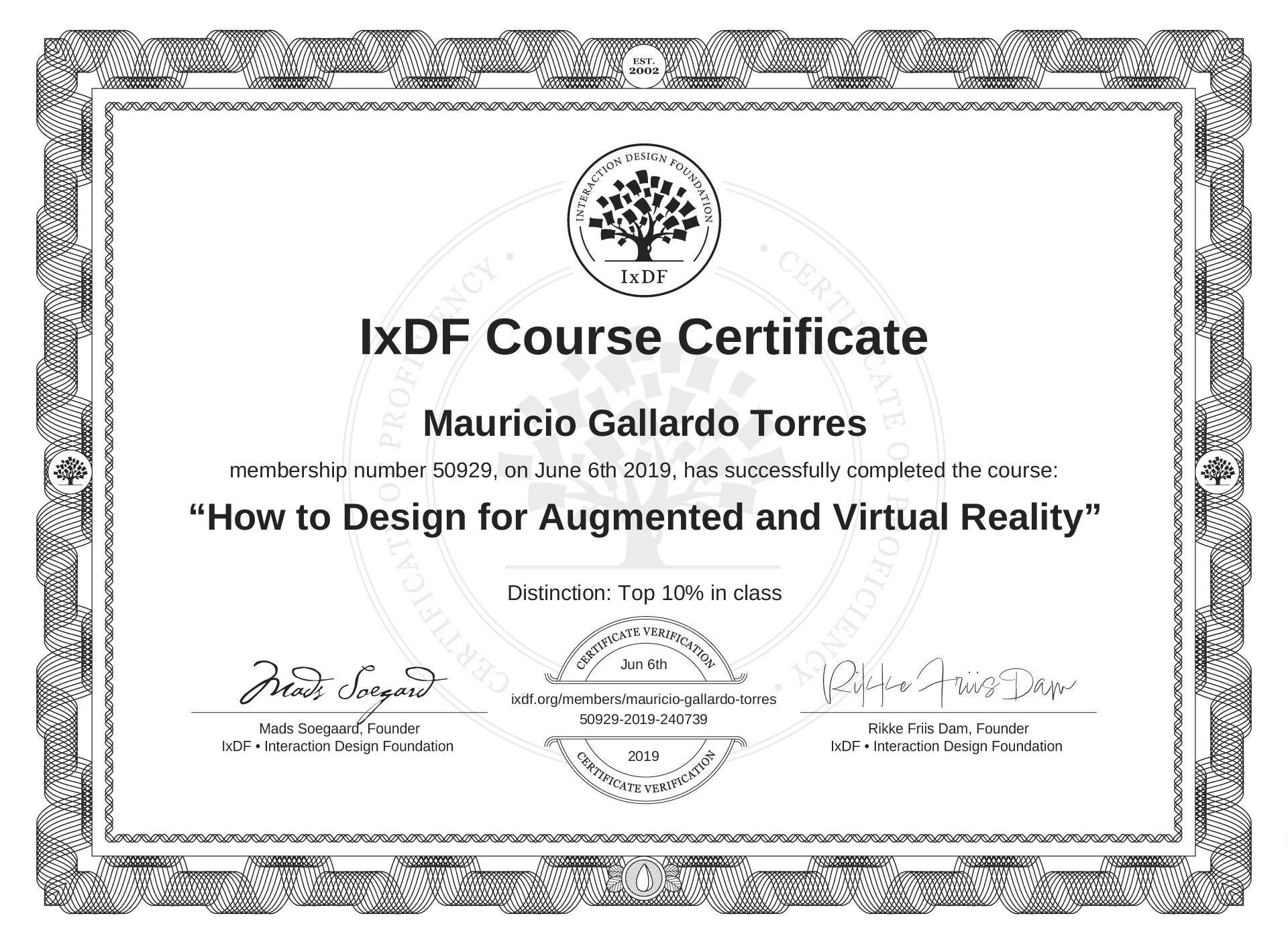 Mauricio Gallardo Torres's IxDF Course Certificate: How to Design for Augmented and Virtual Reality