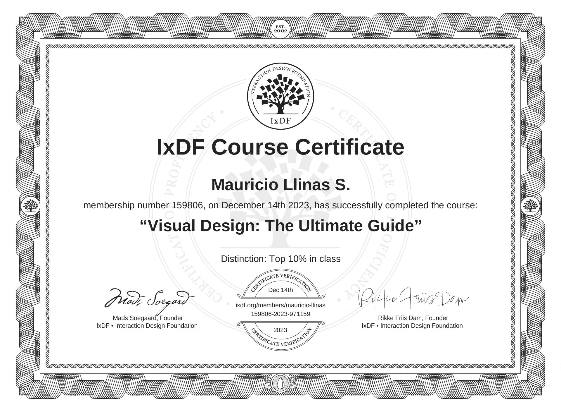 The IxDF Course Certificate above is awarded to Mauricio Llinás S. with a Top 10% Distinction in formal recognition of their coursework surpassing the rigorous benchmarks of exceptional performance established by the IxDF Educational Codex.