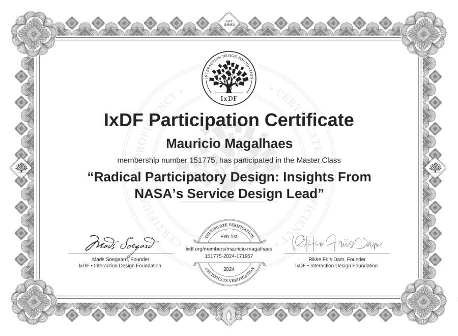 Maurício Magalhães's IxDF Masterclass Certificate: Radical Participatory Design: Insights From NASA’s Service Design Lead