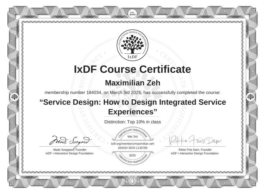 Maximilian Zeh's IxDF Course Certificate: Service Design: How to Design Integrated Service Experiences