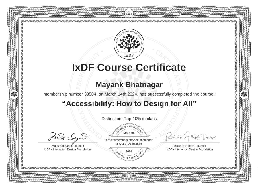 Mayank Bhatnagar's IxDF Course Certificate: Accessibility: How to Design for All