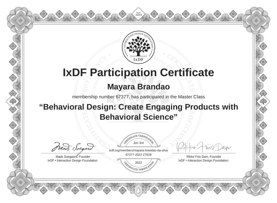 Mayara Brandão's IxDF Masterclass Certificate: Behavioral Design: Create Engaging Products with Behavioral Science