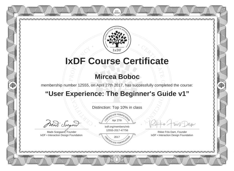The IxDF Course Certificate above is awarded to Mircea Boboc with a Top 10% Distinction in formal recognition of their coursework surpassing the rigorous benchmarks of exceptional performance established by the IxDF Educational Codex.