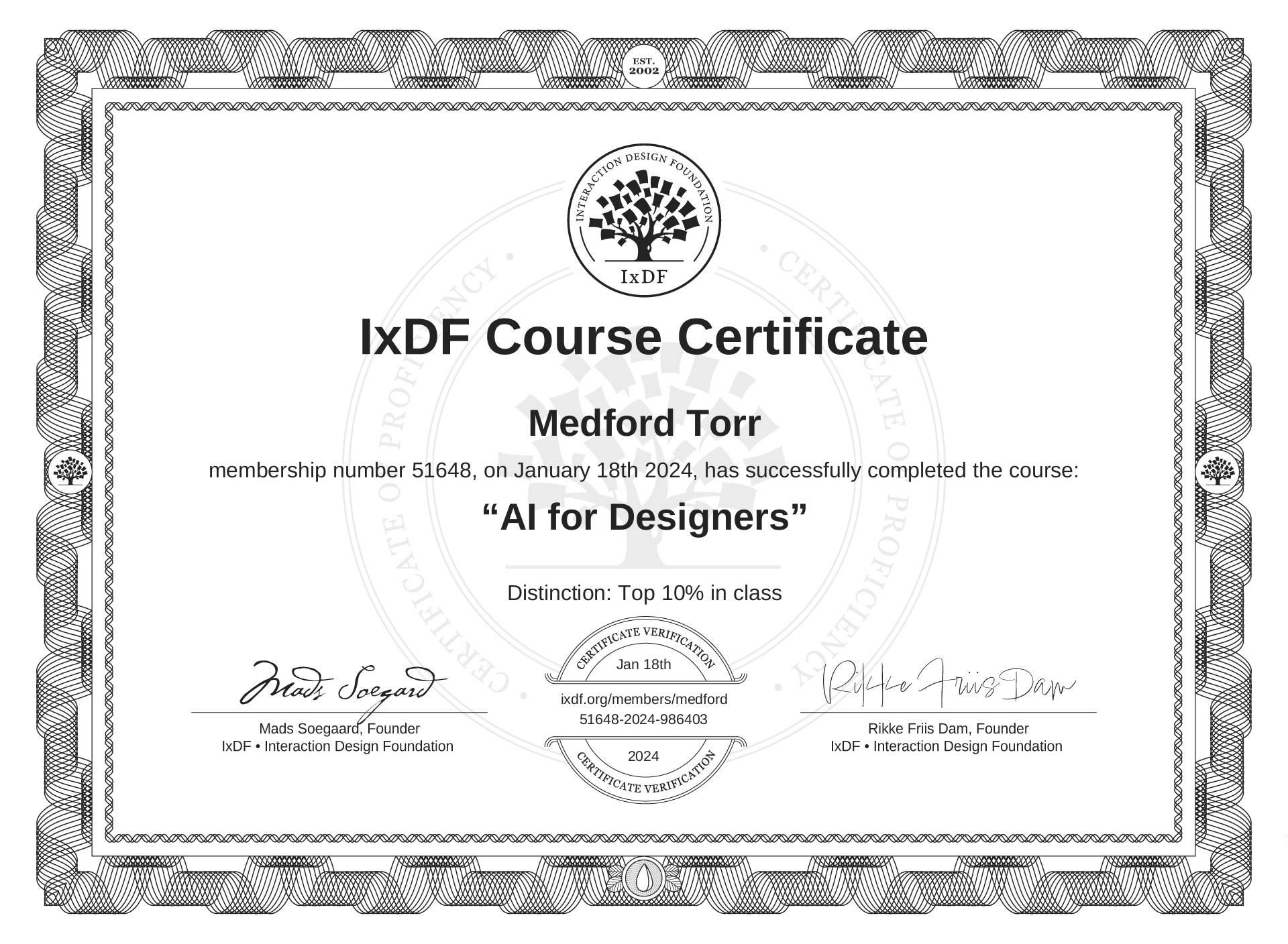 The IxDF Course Certificate above is awarded to Medford Torr with a Top 10% Distinction in formal recognition of their coursework surpassing the rigorous benchmarks of exceptional performance established by the IxDF Educational Codex.