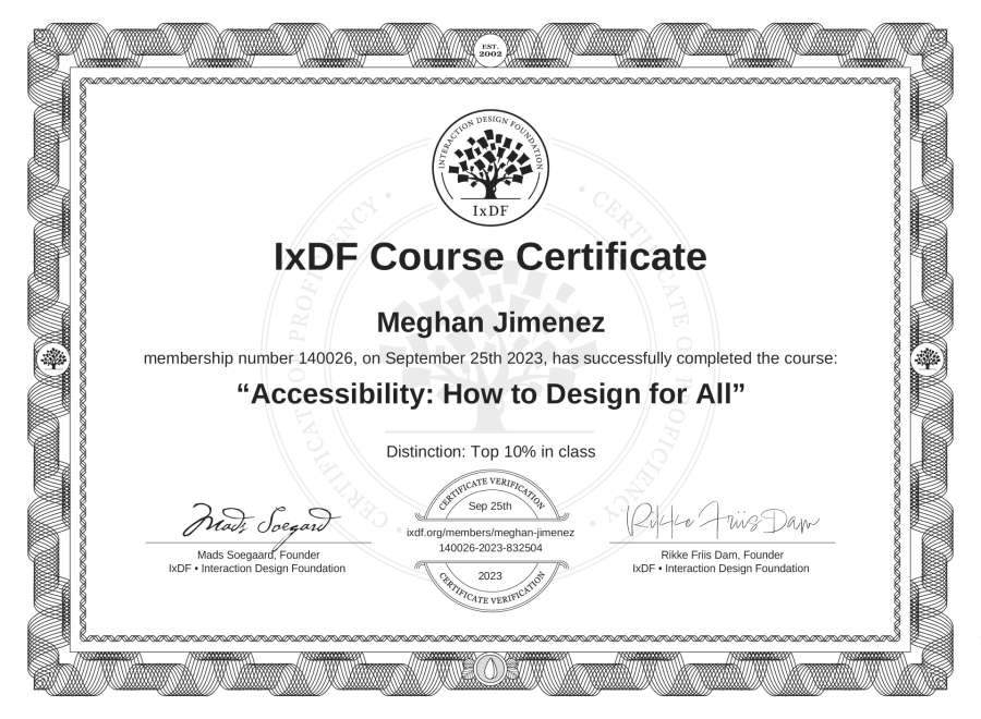 The IxDF Course Certificate above is awarded to Meghan Jimenez with a Top 10% Distinction in formal recognition of their coursework surpassing the rigorous benchmarks of exceptional performance established by the IxDF Educational Codex.