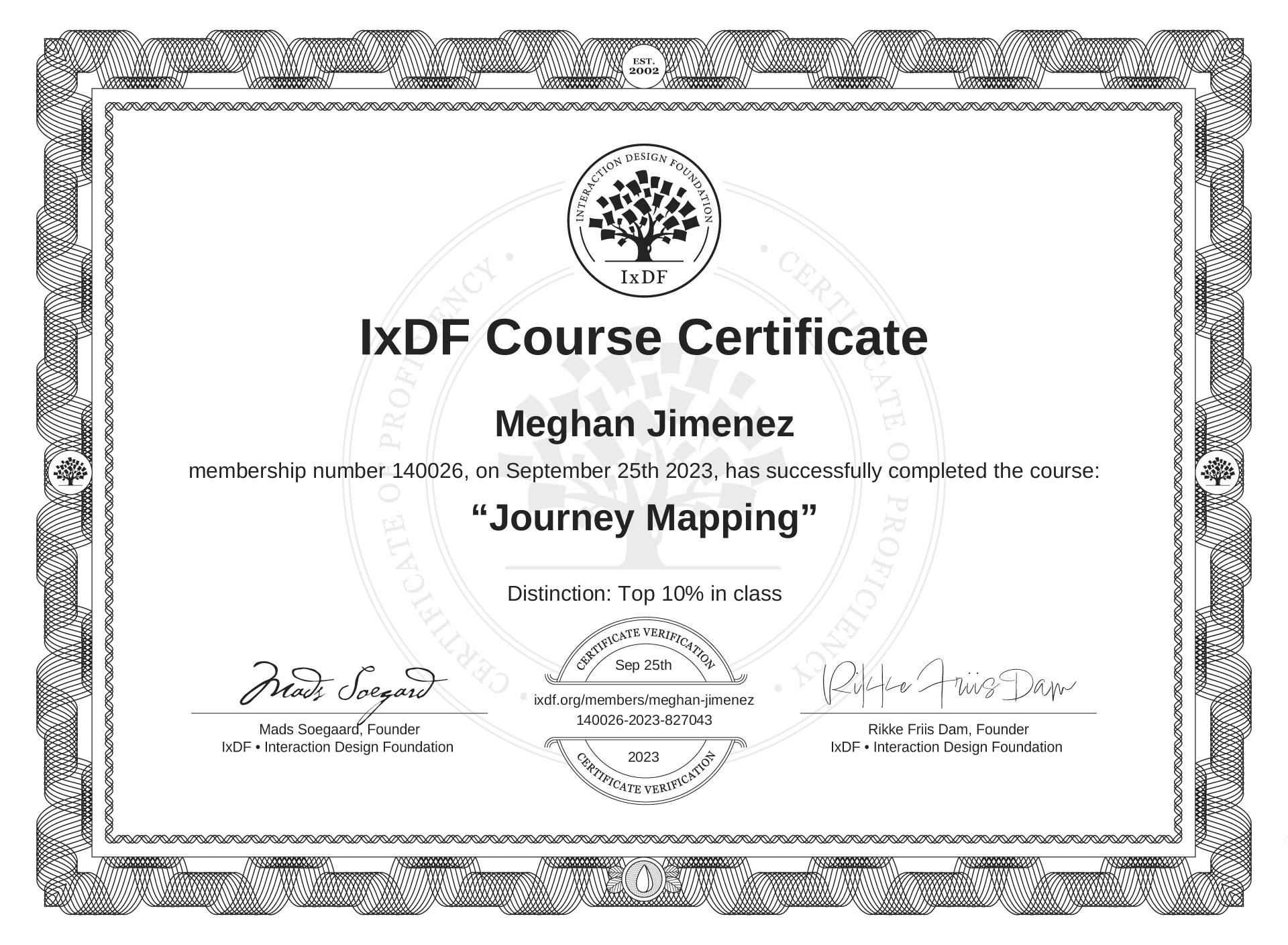 The IxDF Course Certificate above is awarded to Meghan Jimenez with a Top 10% Distinction in formal recognition of their coursework surpassing the rigorous benchmarks of exceptional performance established by the IxDF Educational Codex.