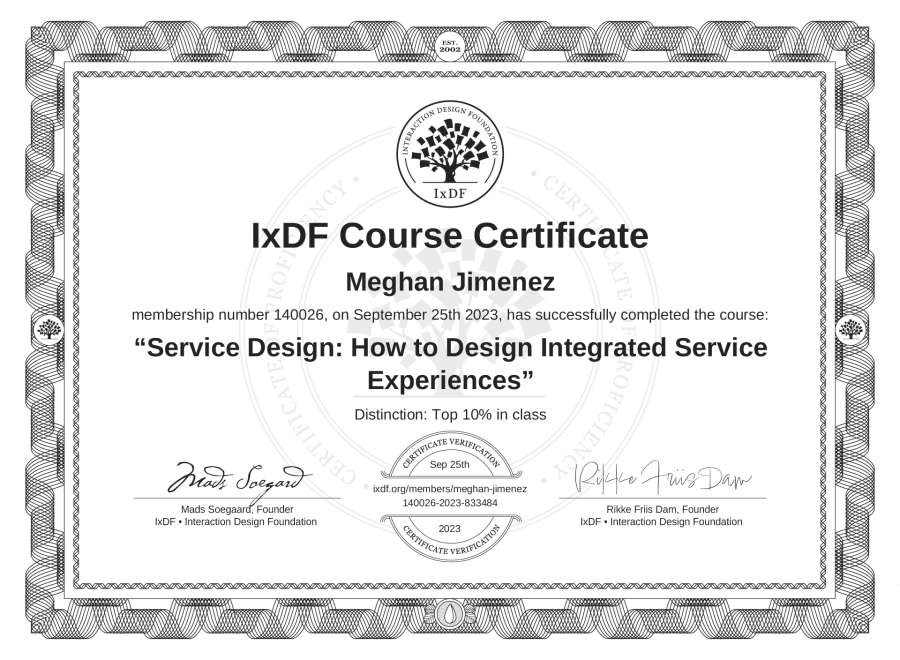 The IxDF Course Certificate above is awarded to Meghan Jimenez with a Top 10% Distinction in formal recognition of their coursework surpassing the rigorous benchmarks of exceptional performance established by the IxDF Educational Codex.