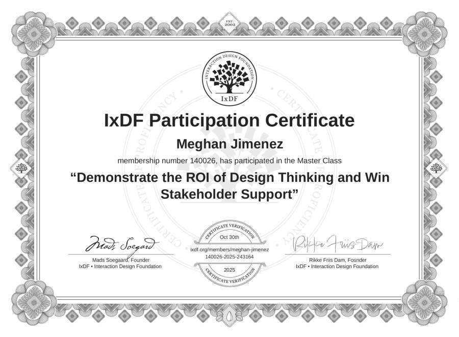 Meghan Jimenez's IxDF Masterclass Certificate: Demonstrate the ROI of Design Thinking and Win Stakeholder Support