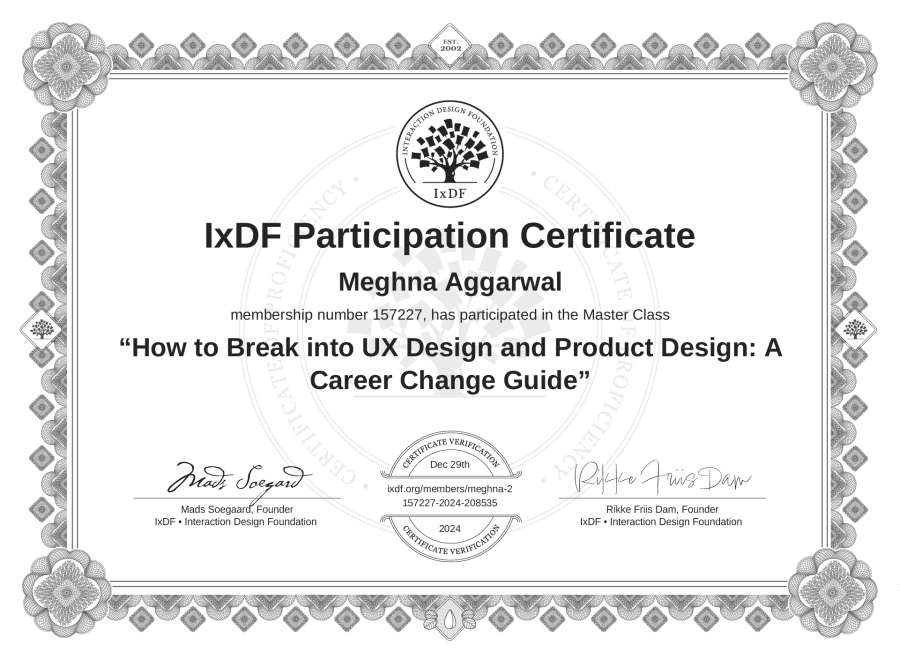 Meghna Aggarwal's IxDF Masterclass Certificate: How to Break into UX Design and Product Design: A Career Change Guide