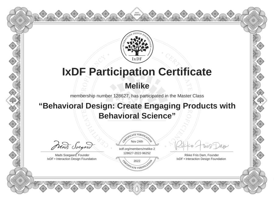 Melike's IxDF Masterclass Certificate: Behavioral Design: Create Engaging Products with Behavioral Science