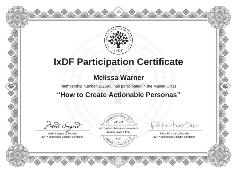 Melissa Warner's IxDF Masterclass Certificate: How to Create Actionable Personas