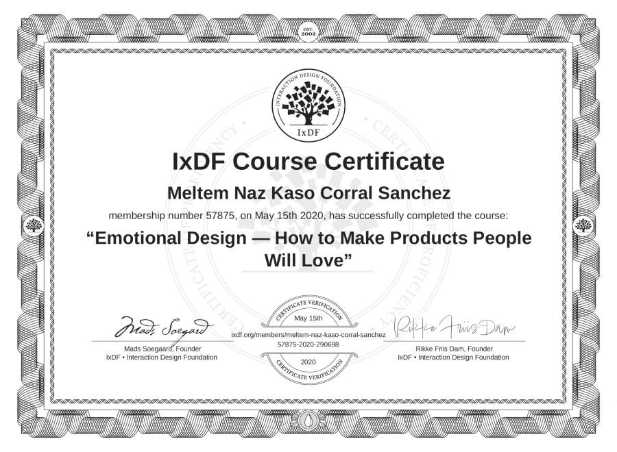 Meltem Naz Kaso Corral Sanchez's IxDF Course Certificate: Emotional Design — How to Make Products People Will Love