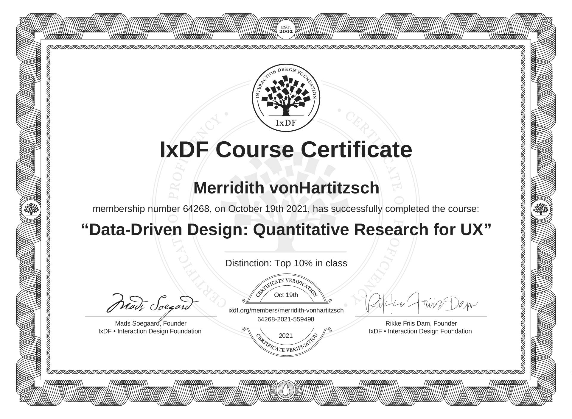 Merridith vonHartitzsch's IxDF Course Certificate: Data-Driven Design: Quantitative Research for UX