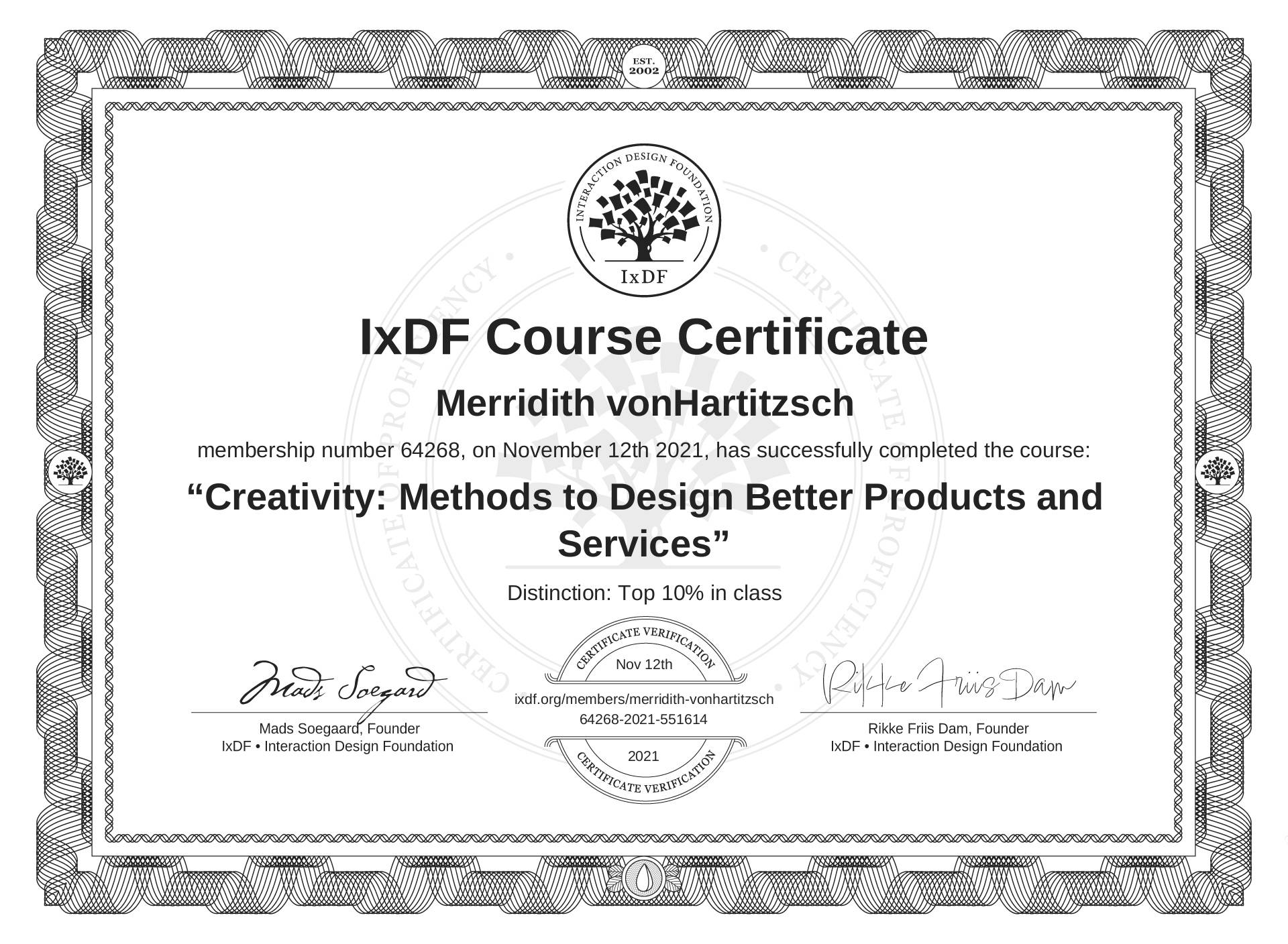 Merridith vonHartitzsch's IxDF Course Certificate: Creativity: Methods to Design Better Products and Services
