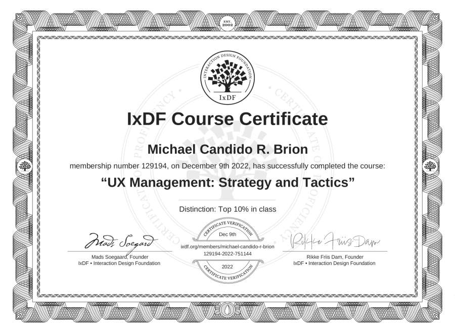 The IxDF Course Certificate above is awarded to Michael Candido R. Brion with a Top 10% Distinction in formal recognition of their coursework surpassing the rigorous benchmarks of exceptional performance established by the IxDF Educational Codex.