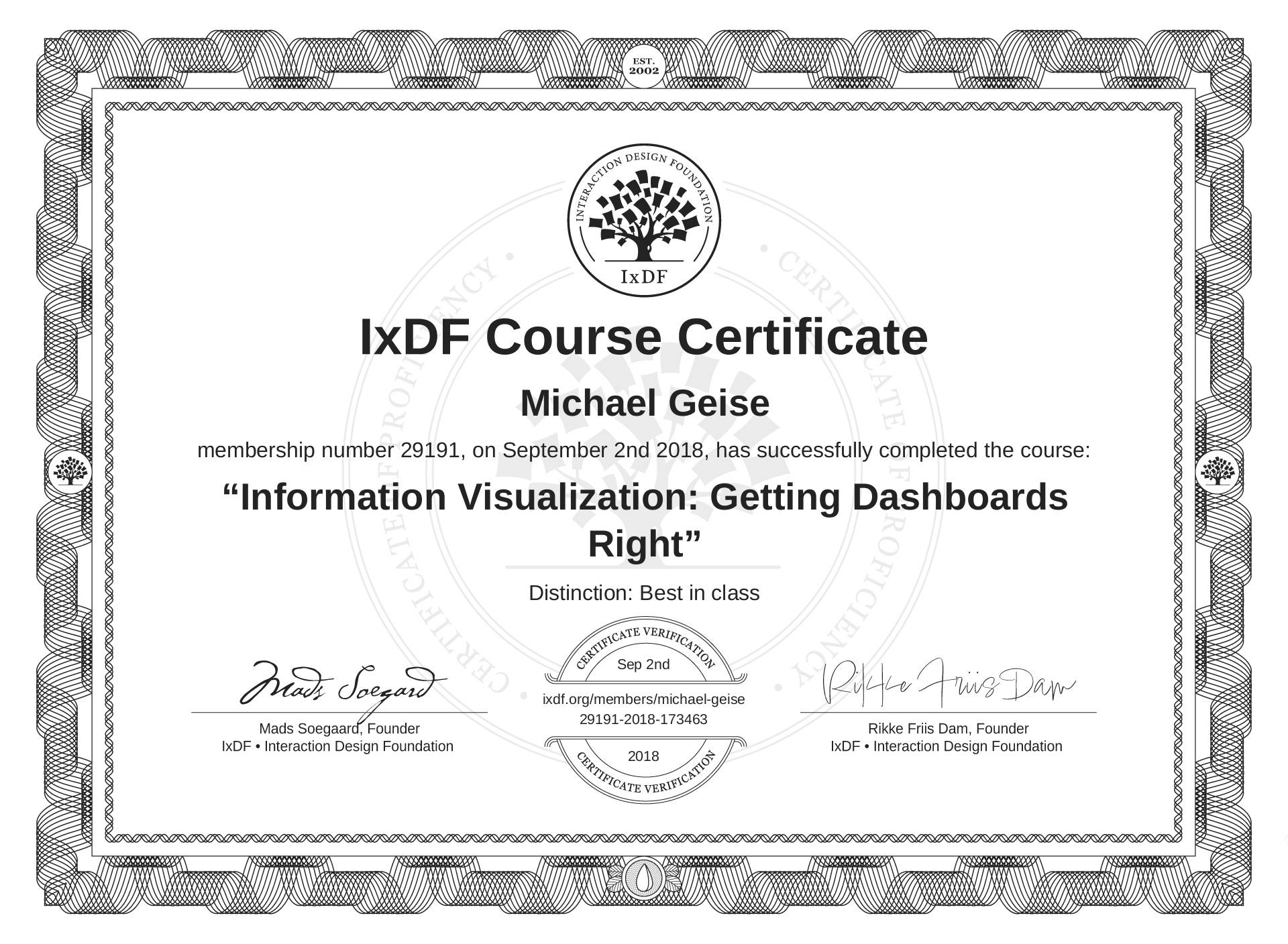 The IxDF Course Certificate above is awarded to Michael Geise with a Best in Class Distinction in formal recognition of their coursework surpassing the rigorous benchmarks of exceptional performance established by the IxDF Educational Codex.
