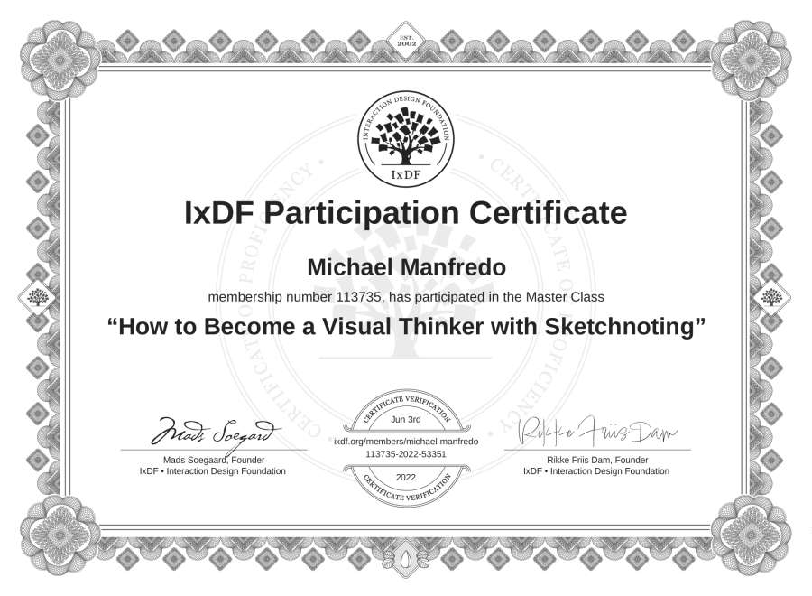 Michael Manfredo's IxDF Masterclass Certificate: How to Become a Visual Thinker with Sketchnoting